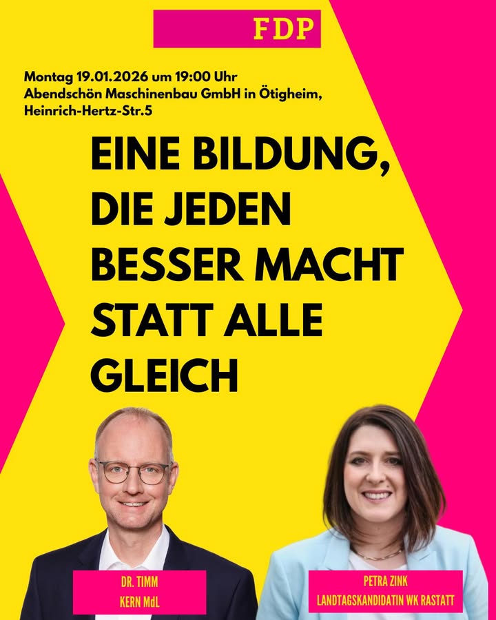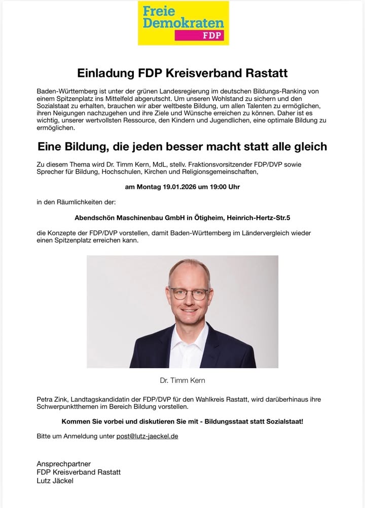 Baden-Württemberg ist unter der grünen Landesregierung im deutschen Bildungs-Ranking von einem Spitzenplatz ins Mittelfeld abgerutscht. Um unseren Wohlstand zu sichern und den Sozialstaat zu erhalten, brauchen wir aber weltbeste Bildung, um allen Talenten zu ermöglichen, ihren Neigungen nachzugehen und ihre Ziele und Wünsche erreichen zu können. Daher ist es wichtig, unserer wertvollsten Ressource, den Kindern und Jugendlichen, eine optimale Bildung zu ermöglichen. 🎓🎒 Eine Bildung, die jeden besser macht statt alle gleich Zu diesem Thema wird Dr. Timm Kern, MdL, stellv. Fraktionsvorsitzender FDP/DVP sowie Sprecher für Bildung, Hochschulen, Kirchen und Religionsgemeinschaften, am Montag 19.01.2026 um 19:00 Uhr in den Räumlichkeiten der: Abendschön Maschinenbau GmbH in Ötigheim, Heinrich-Hertz-Str.5 die Konzepte der FDP/DVP vorstellen, damit Baden-Württemberg im Ländervergleich wieder einen Spitzenplatz erreichen kann. Petra Zink, Landtagskandidatin der FDP/DVP für den Wahlkreis Rastatt, wird darüberhinaus ihre Schwerpunktthemen im Bereich Bildung vorstellen. Kommen Sie vorbei und diskutieren Sie mit - Bildungsstaat statt Sozialstaat! Bitte um Anmeldung unter post@lutz-jaeckel.de