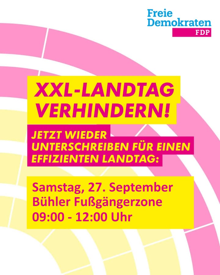 Besucht uns am Samstag, 27. September in der Bühler Fußgängerzone (Schwanenstraße). Wir sammeln Unterschriften zum Volksbegehren "XXL-Landtag verhindern". #liberal #liberaldemokratie #fdp #landtag #politik #bühl #rastatt #xxllandtagverhindern #demokratie